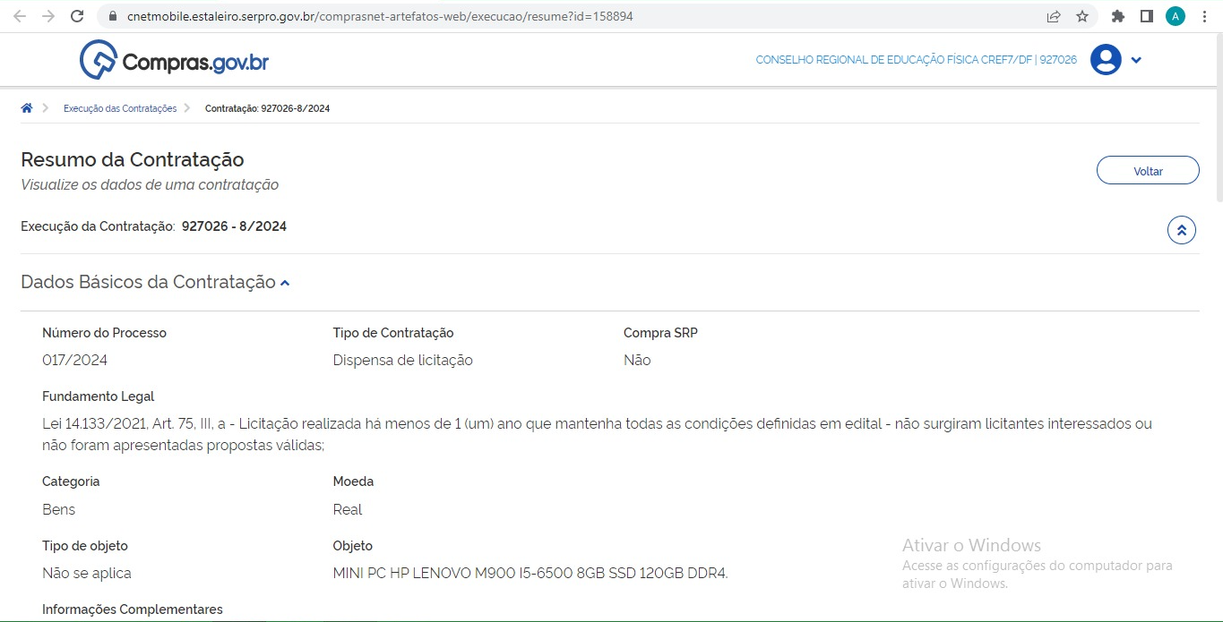 O CONSELHO REGIONAL DE EDUCAÇÃO FÍSICA DA SÉTIMA REGIÃO – CREF7/DF torna público de acordo com a Lei 14.133/2021, Processo de Licitação nº 017/2024 para a dispensa de licitação para a aquisição 1 (um) microcomputador MINIPC.