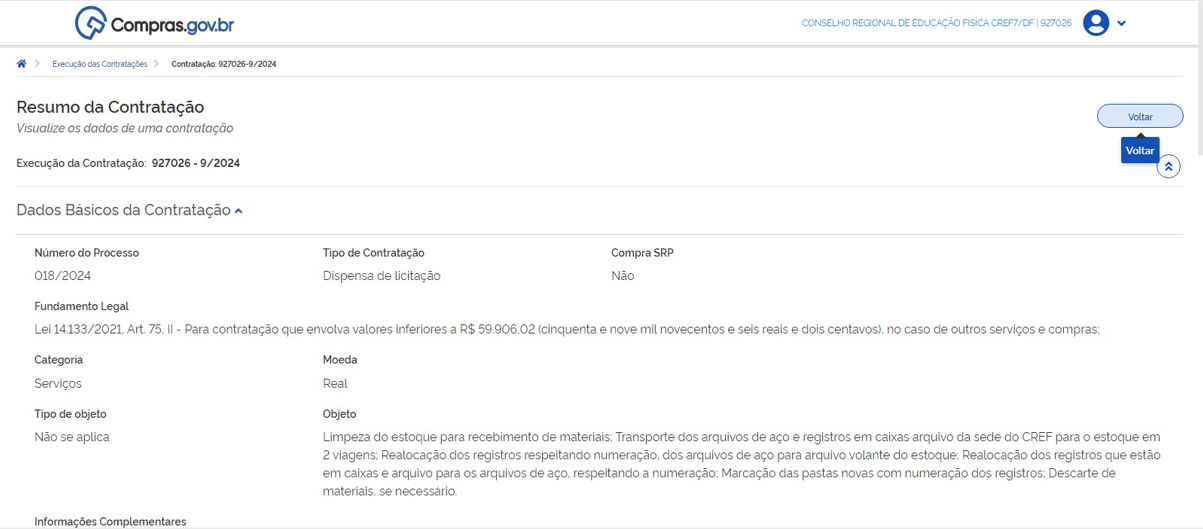 O CONSELHO REGIONAL DE EDUCAÇÃO FÍSICA DA SÉTIMA REGIÃO – CREF7/DF torna público de acordo com a Lei 14.133/2021, Processo de Licitação nº 006/2024 que pretende realizar a CONTRATAÇÃO DIRETA, por DISPENSA DE LICITAÇÃO, em favor da futura contratada, ASSOCIAÇÃO DE CENTRO DE TREINAMENTO DE EDUCAÇÃO FÍSICA ESPECIAL - CETEFE, inscrita no CNPJ sob o nº 26.444.653/0001-53, para prestação de serviços especializados em tratamento documental do acervo de documentos do CREF7/DF, incluindo atividades de higienização, preparação, digitalização de documentos, tratamento de imagens, indexação de documentos com reconhecimento ótico de caracteres (OCR)