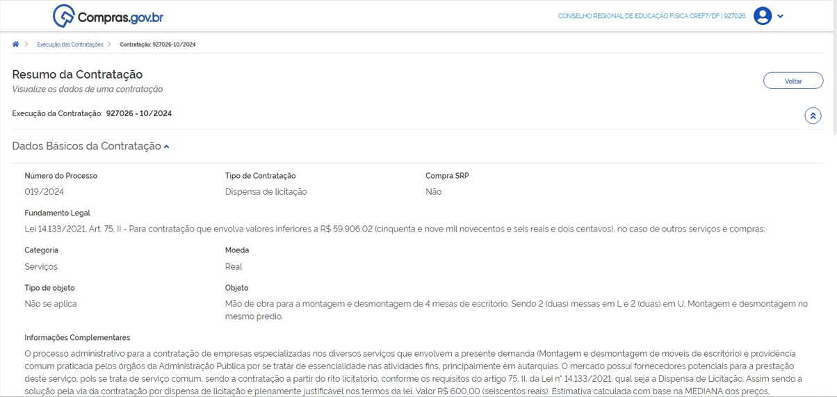 O CONSELHO REGIONAL DE EDUCAÇÃO FÍSICA DA SÉTIMA REGIÃO – CREF7/DF torna público de acordo com a Lei 14.133/2021, Processo de Licitação nº 019/2024 para a dispensa de licitação para a contratação de uma empresa especializada em serviços de montagem e desmontagem de móveis na sede do CREF7/DF.